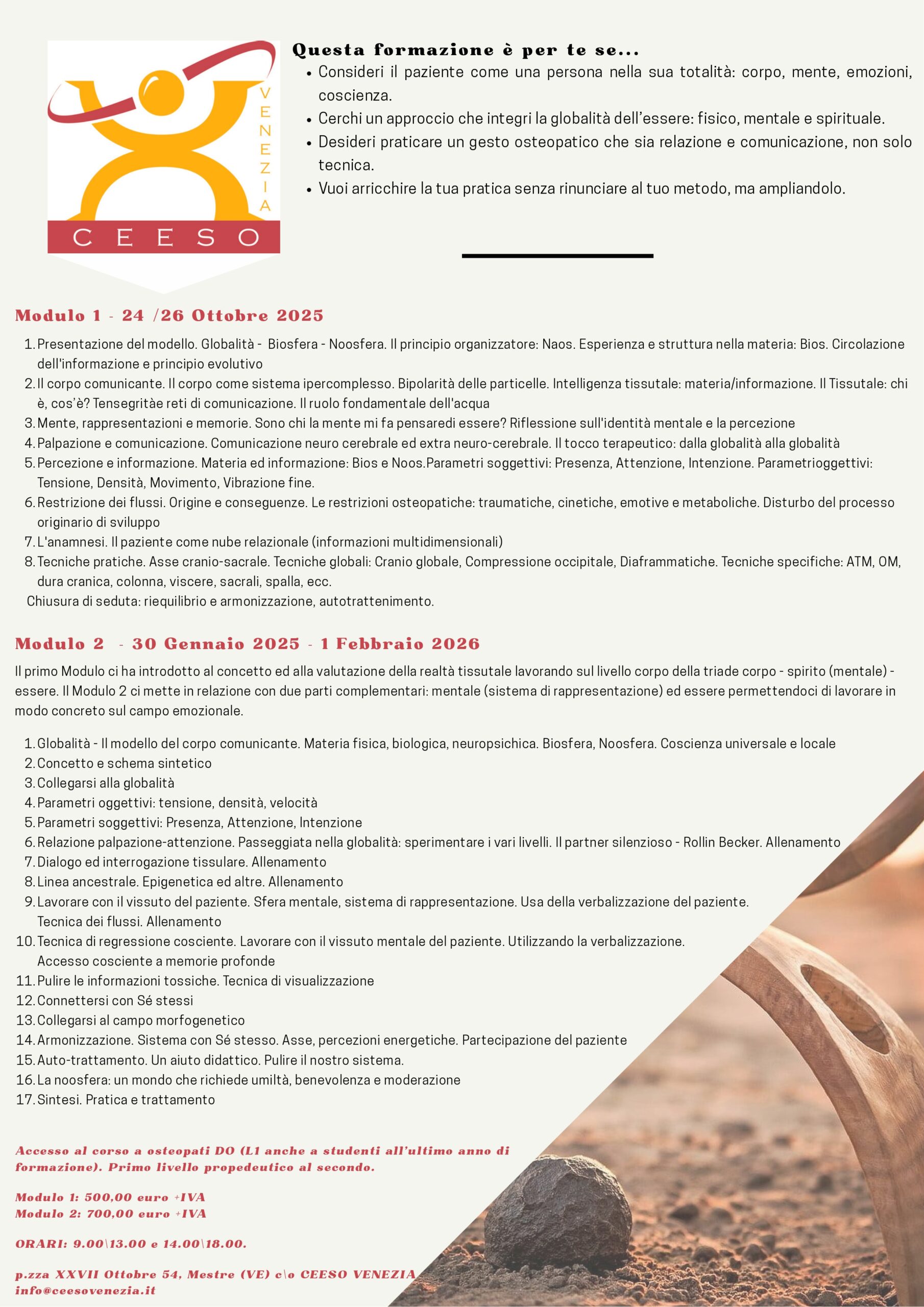 Formazione continua Approccio tissutale del corpo comunicante Un percorso formativo dedicato agli osteopati che desiderano approfondire le proprie competenze in osteopatia tissutale, attraverso un modello che unisce teoria, percezione e pratica terapeutica. Con Gerald Urdich DO. Contattaci